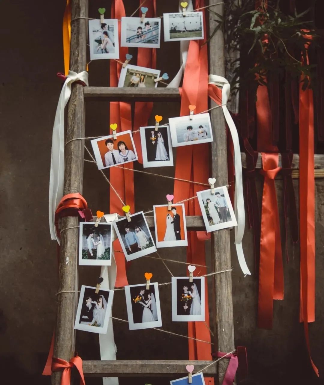 酒店办婚礼的那套投影仪播放回忆相册视频的玩法,在乡下也可以换个点子,物尽其用——把爷爷的爸爸留下来的木头梯子搭成一个照片墙,什么相知相爱都给亲朋好友一一展现。