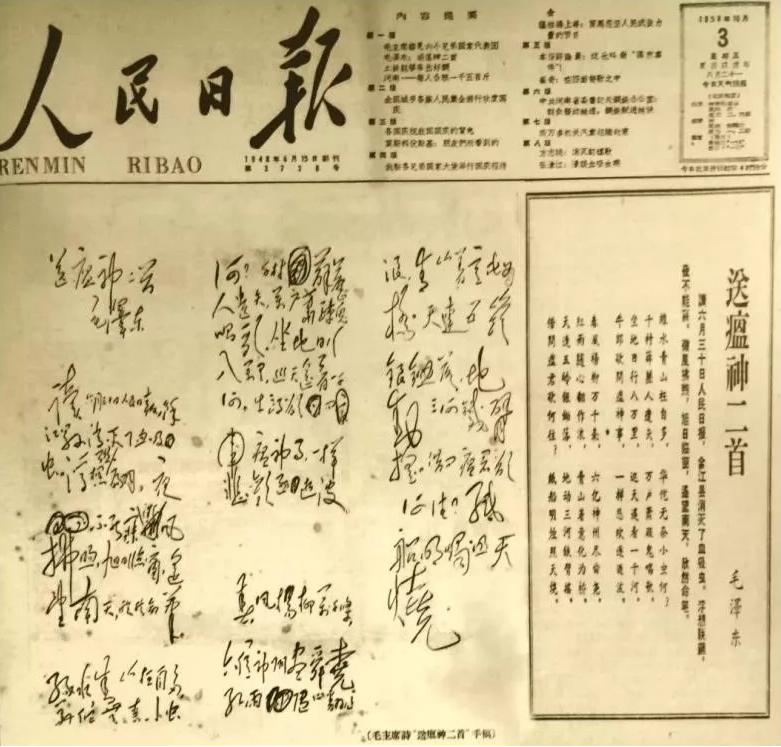 毛泽东读后浮想联翩,夜不能寐,临窗遥望南天,于7月1日赋《送瘟神》二首以表欣喜之情: