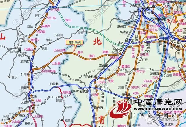 记者通过综合信息了解到,根据2019年3月中国铁路设计集团《新建铁路雄安至忻州铁路可行性研究(送审稿)》,雄忻高铁起自在建京雄城际铁路雄安站,向西经雄安新区启动区,于安新和容县之间设雄安西站,继续向西至徐水附近京广高铁东侧并行向南,于既有保定东站东侧并场设站,预留石雄城际接轨条件。之后线路连续上跨京广高速线、京港澳高速公路,折向西,于新金线河北预留莲池线路所,预留远期雄忻引入条件,跨越保沧高速和京广铁路至望都设站,西行经曲阳、阜平设站,向西穿越太行山进入山西省忻州市境内,于五台山景区旅客服务中心东南10公里的新路沟设五台山南站,向西经五台县南侧、五台山机场南侧设站,跨过滹沱河,进入忻州市忻府区,接入大西客专忻州西站,近期利用大西客专引入太原枢纽太原南站,远期预留新建双线引入太原枢纽新客站。线路全长为340.167km,其中河北省境内227.534km,山西省境内112.633km。全线桥梁长度187.437km,隧道长度114.418km,桥隧比例88.74%。
