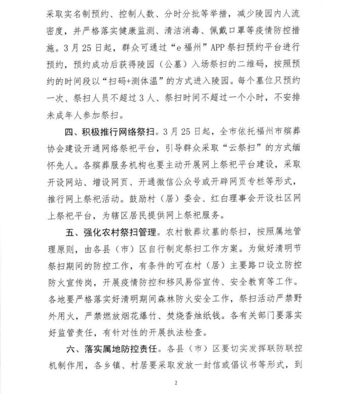 二、严格祭祀管控。广大市民要自觉暂停在祠堂、祖厝等场所进行聚集性祭祀活动。严禁市民在任何公共场所焚烧冥币、纸钱等祭祀用品和燃放鞭炮。全市将对所有殡葬服务场所通行路段实行人员和车辆交通管制。
