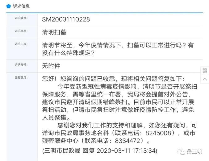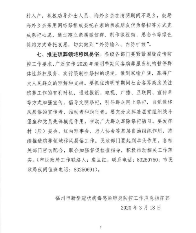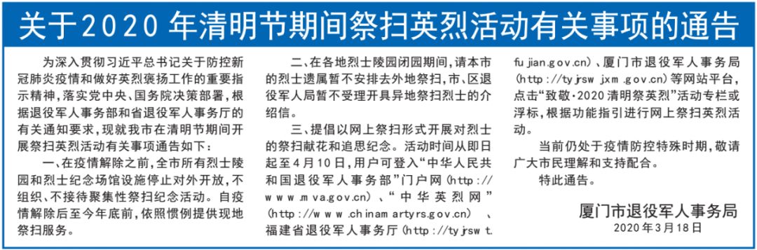 今年清明节,正值新冠肺炎疫情防控工作的攻坚期、关键期。为扎实做好疫情防控工作,避免清明节期间因人员聚集引发病毒传播和交叉感染,根据民政部办公厅关于做好2020年清明节祭扫工作的通知精神和福建省“十个不放松”“十二个加强”要求,现就清明期间暂停群众现场祭扫活动通告如下: