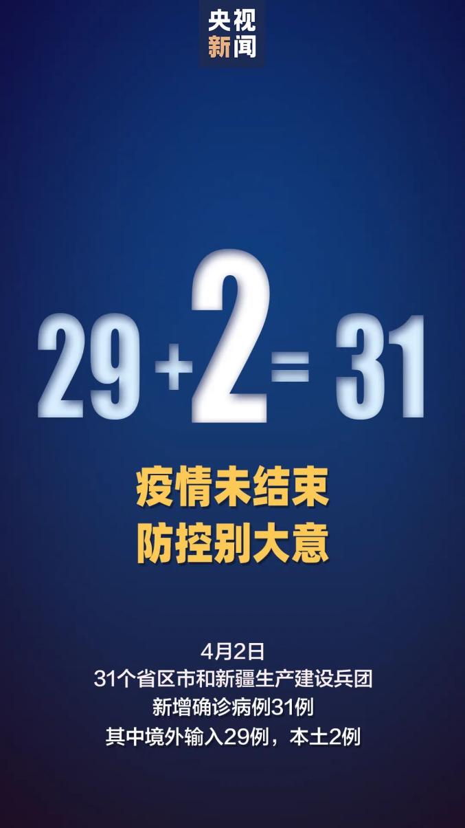 4月2日0-24时,31个省(自治区、直辖市)和新疆生产建设兵团报告新增确诊病例31例,其中29例为境外输入病例,2例为本土病例(辽宁1例,广东1例);新增死亡病例4例(湖北4例);新增疑似病例12例,均为境外输入病例。