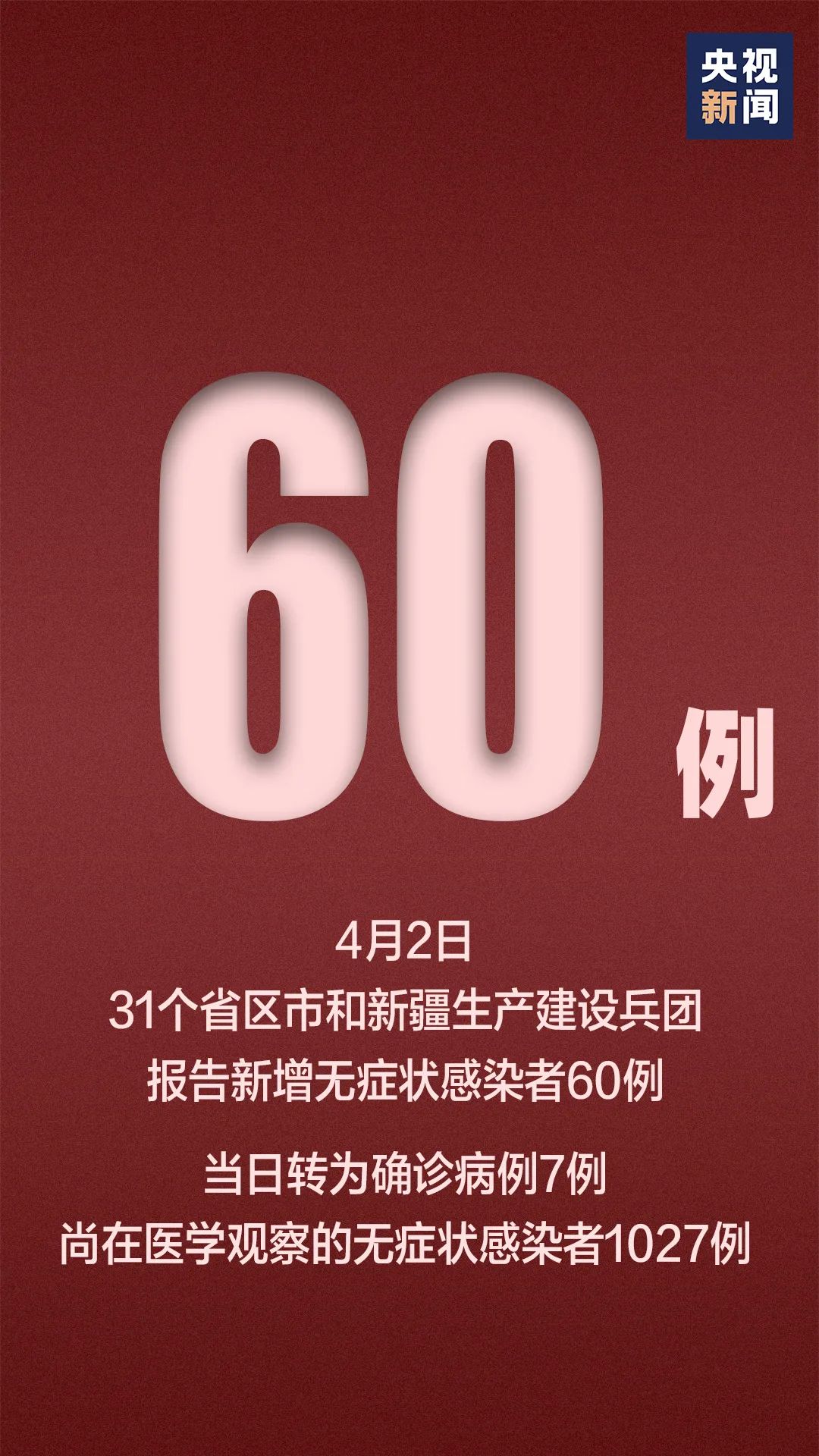 31个省(自治区、直辖市)和新疆生产建设兵团报告新增无症状感染者60例,其中境外输入无症状感染者7例;当日转为确诊病例7例(境外输入转为确诊7例);当日解除医学观察101例(境外输入解除医学观察5例)。尚在医学观察无症状感染者1027例(境外输入221例)。