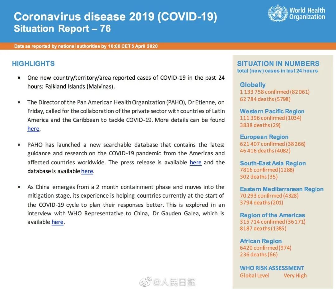 当地时间4月5日,世界卫生组织发布第76期新冠肺炎疫情报告。报告中称,中国经过两个月奋战,疫情已经由“遏制阶段”(containment phase)进入到“缓疫阶段”(mitigation stage),中国经验正在帮助其他国家的抗疫行动。