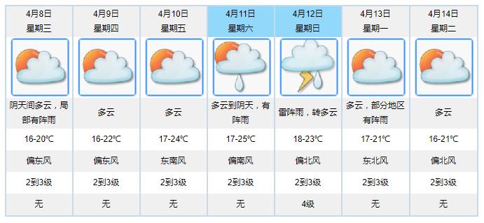 预计今天,阴天,有阵雨,气温15到18度。天气阴凉,注意适时添衣,谨防感冒。预计8日阴天间多云,局部有阵雨;9至10日多云,可见阳光,气温逐渐回升;展望11至12日有一次雷雨天气。近期天气变化节奏快,请留意最新预报预警信息。