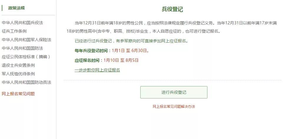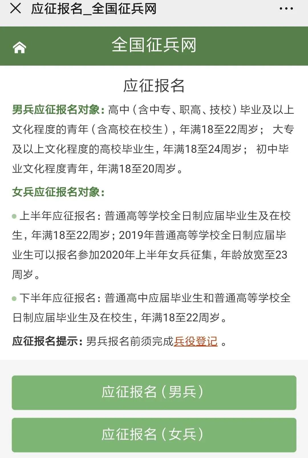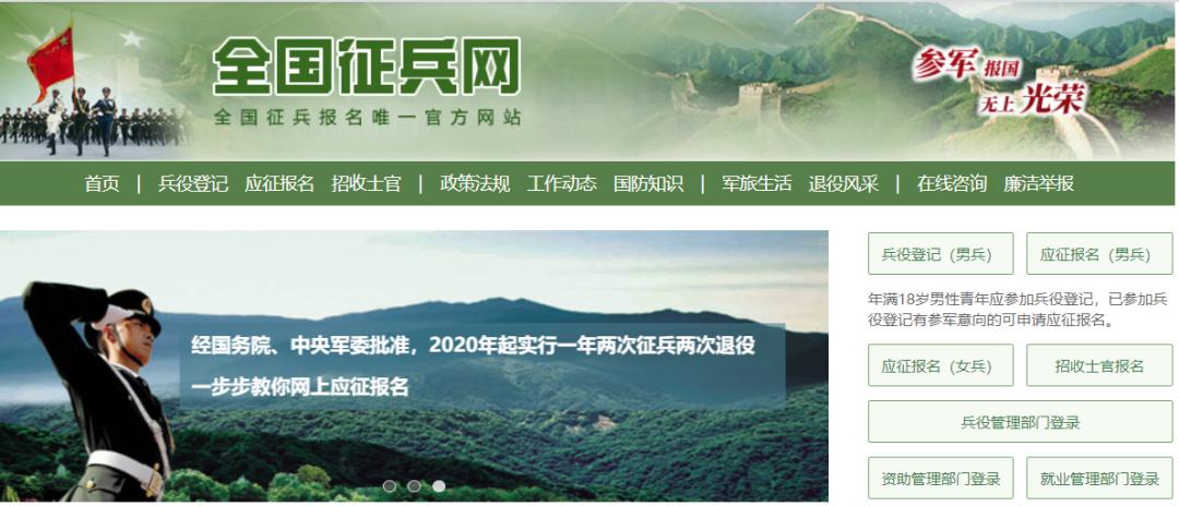 在全国征兵网首页右侧,按照自身条件点击“兵役登记”或“应征报名”;
