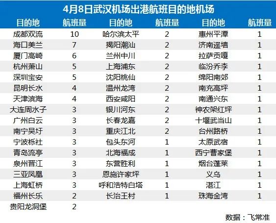 从目的地来看,武汉机场首批复航航班数量最多的城市为成都,为10班;海南省(海口及三亚)也有10班,广东地区机场总计有13班。
