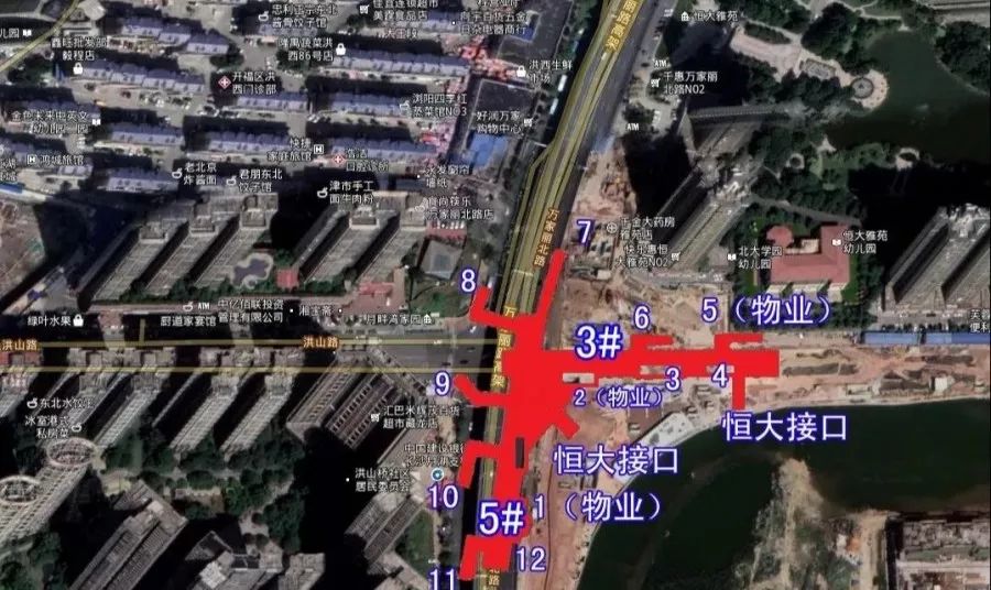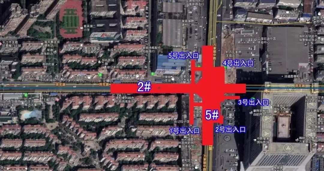 位于万家丽路与洪山路交叉路口,该站为5号线与3号线的换乘站,规划有7个出入口。