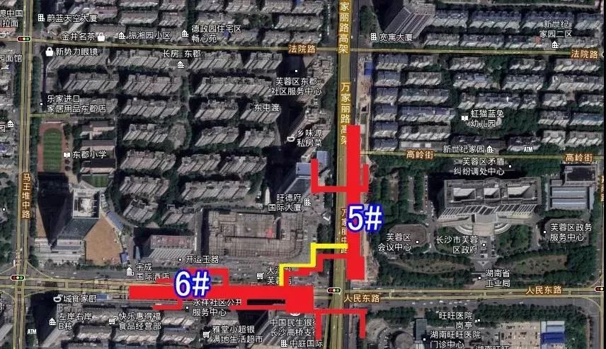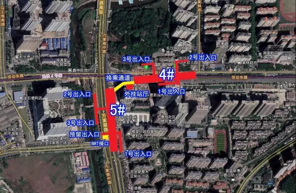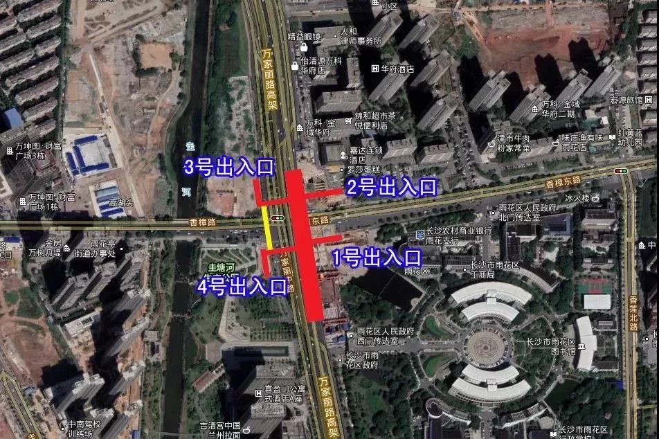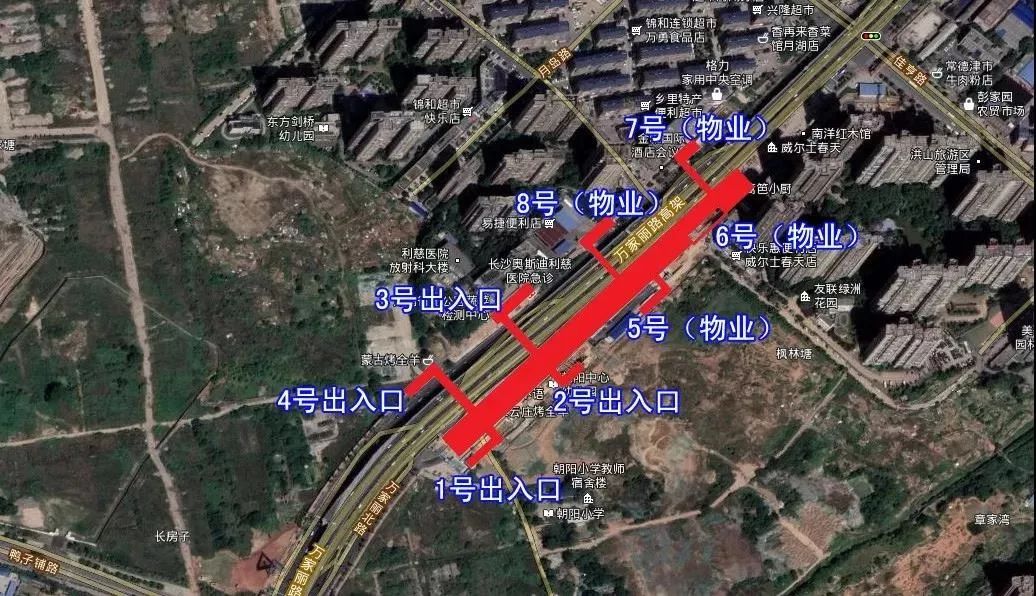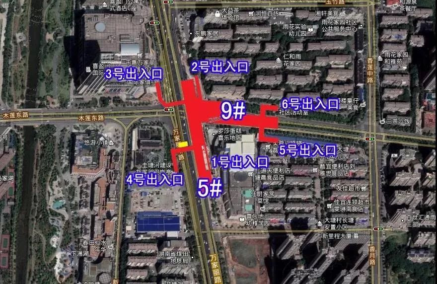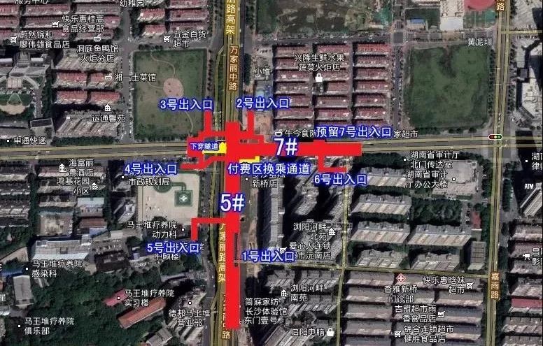 位于晚报大道与万家丽路交叉口,沿万家丽路南北布置,湖南省马王堆医院东北侧,规划有7个出入口。