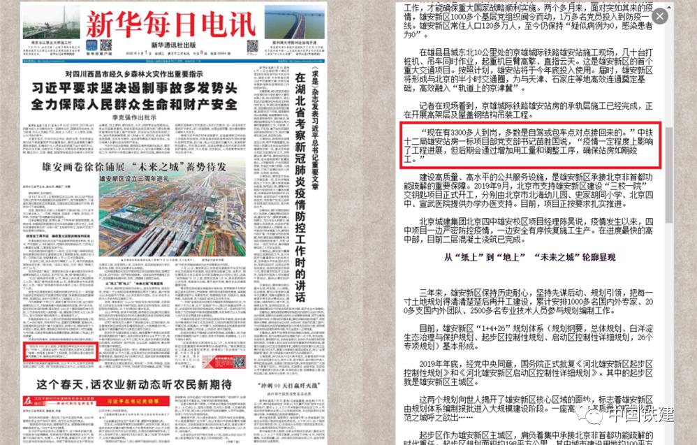 4月1日,在雄安新区设立三周年之际,新华社记者采访报道中铁十二集团承建的京雄城际铁路雄安站房工程的建设情况,稿件在《新华每日电讯》等中央主流媒体刊发。中铁十二局集团采取“点对点”包车等方式,做好疫情防控各项工作,有序帮助作业人员安全返岗,实现防疫复工两不误,确保重大国家战略顺利实施。金字山互通立交全面开工