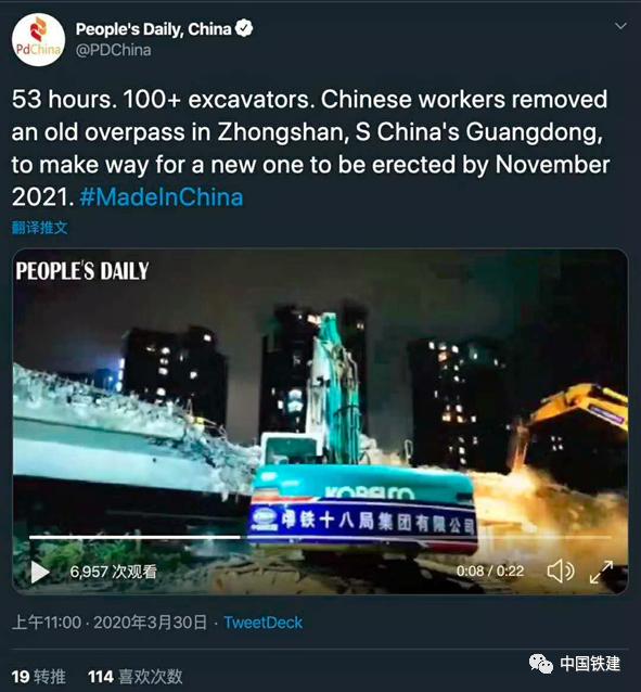 3月30日,人民日报推特对中铁十八局集团中山市金字山互通立交工程全面开建进行了报道。金字山互通立交是广东省重点交通枢纽工程,也是中山加速融入粤港澳大湾区的重点项目。项目部联合业主、设计、交管等单位共同攻关,投入220余人,100余台机械,开展大兵团快速作战,提前顺利完成了南外环起湾道跨线桥的拆除任务,为金字山互通立交全面开建奠定了坚实基础。建成后,将极大提升中山市交通路网通达能力,还能有效增进中山与珠海、江门等粤港澳大湾区城市的沟通联系,对加速中山融入粤港澳大湾区具有重要意义。