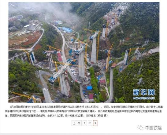 3月29日,新华社采用图文结合的形式,报道中铁十二局集团承建的郑万高铁湖北段保康县马桥镇两河口双线特大桥复工建设情况。郑万高铁湖北段全长287.2公里,设计时速350公里,是国家铁路网的重要组成部分,也是连接中原地区和西南地区的重要高速客运通道。其中,两河口双线特大桥是郑万高铁湖北段第一高桥,最高墩111米。新华社主办的《新华每日电讯》《经济参考报》以及其他主流媒体进行了同步报道。中国在非洲最大规模水稻项目迎丰收