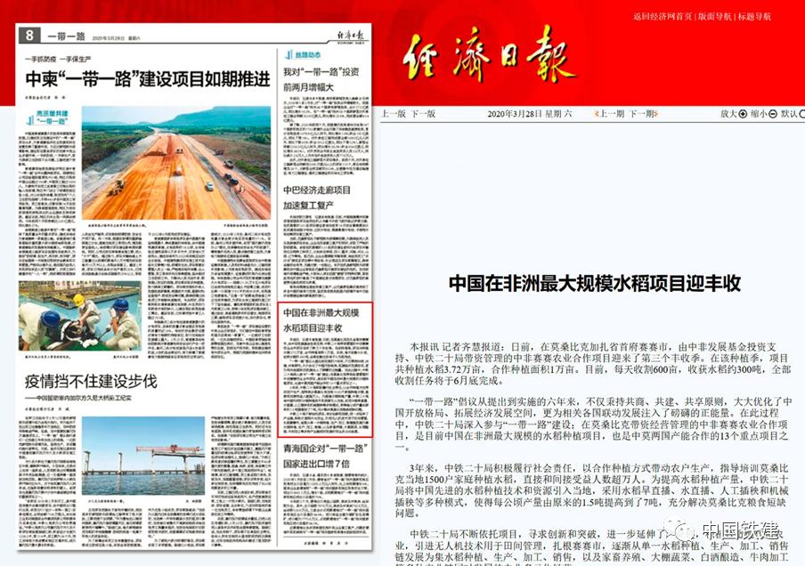 3月28日,经济日报刊发了由中非发展基金投资支持、中铁二十局集团带资管理的莫桑比克中非赛赛农业合作项目,迎来了第三个丰收季的报道。该项目共种植水稻3.72万亩,合作种植面积1万亩。目前,每天收割600亩,收获水稻约300吨,全部收割任务将于6月底完成。中铁二十局助力万博省疫情防控隔