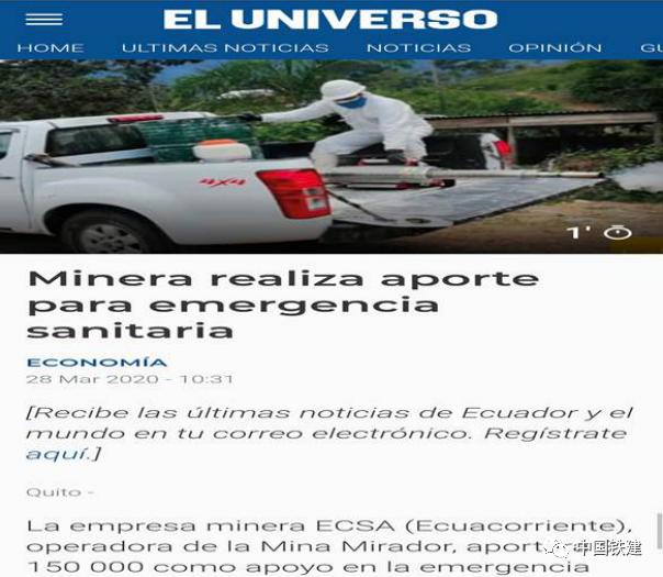 3月28日,厄瓜多尔主流媒体《环球报》报道了中国铁建国投集团所属中铁建铜冠厄瓜多尔ECSA公司向厄瓜多尔社区紧急援助医疗物资和生活物资、共同抗疫的新闻。报道指出,米拉多矿山的运营公司ECSA,支援项目主要包括医疗和卫生物资的捐赠,例如N95口罩、医用口罩、酒精消毒液、香皂、医用手套、红外线体温计、消毒喷雾器及其他物品。铁建国际筹集15万只口罩运抵卢赛尔体育场