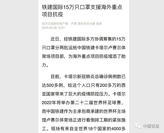 3月26日,经济日报报道铁建国际筹集的15万只口罩分两批运抵中国铁建卡塔尔卢赛尔体育场项目部,助力海外重点项目防疫。原标题:《最美四月天,又一波全球媒体聚焦中国铁建》