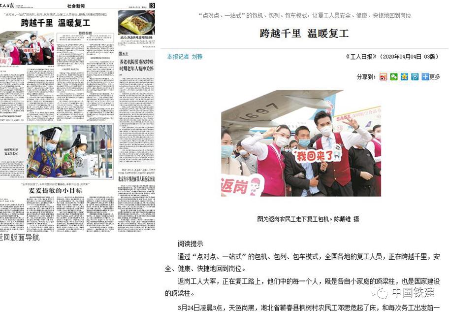4月4日,《工人日报》3版头条以《跨越千里 温暖复工》为题报道了全国各地通过“点对点、一站式”的包机、包列、包车模式,帮助复工人员跨越千里,安全、健康、快捷回到岗位的感人故事。中铁十一局集团郑万高铁重庆段土建9标项目一手抓防疫,一手抓复工生产,完善专项防控方案及应急预案,全面排查返岗返工人员的健康状况和活动轨迹,建立全员健康专项档案,多举措保障人员返岗复工;中铁二十三局集团厦门溪东路项目工人在项目部的帮助下,搭乘“返岗专车”返回工作岗位,展现了企业主动作为,迅速组织复工复产的决心和行动。重点控制性工程稳步推进