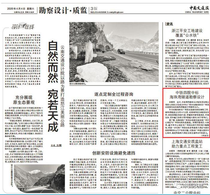 4月4日,《中国铁交通报》头版报道了中铁建重庆投资集团投资、中铁十七局集团建设的合安高速公路重点控制性工程涪江特大桥复工情况。重庆合川至四川安岳高速公路重庆段全长95公里,建成后将是连接重庆两江新区和成都天府新区、重庆江北国际机场和成都天府国际机场最便捷快速的直达通道。铁四院中标海珠湾勘察设计项目