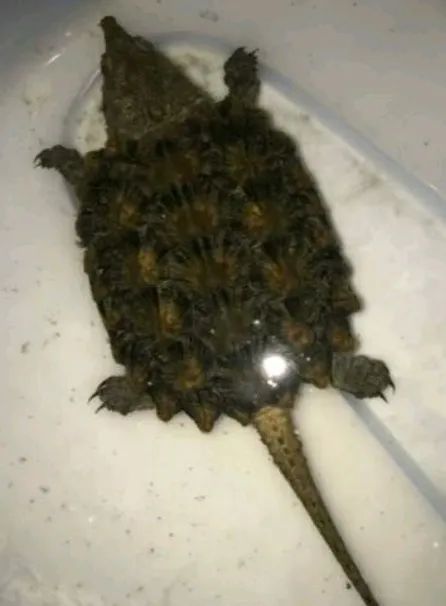 我提前饿了它一天,晚上让周洋举着手机,我一探手把鳄龟掐住,拿了只小草虾指着它。它发疯式一顿乱拱,后腿扒拉着我,白炽灯下,棱角闪着寒光。手机里传来阵阵笑声,我赶紧把它撂回盆里。
