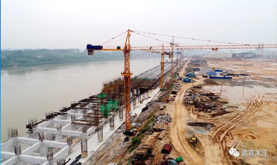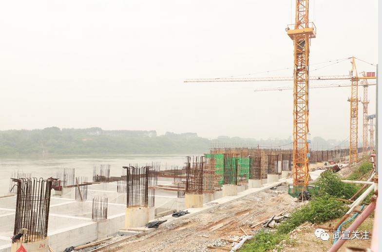 4、底层立柱及纵横连系梁(AB排)已完成砼浇筑,第二层立柱、纵横连系梁(ABC排)已完成92%,轨道梁及面层纵横梁已在搭设施工作业面,码头上部结构施工总体完成约65%。