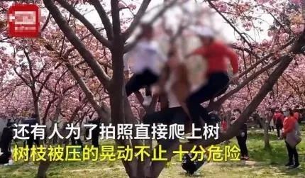 开封一公园内樱花树上开满大妈 摆出各种姿势蹦跶