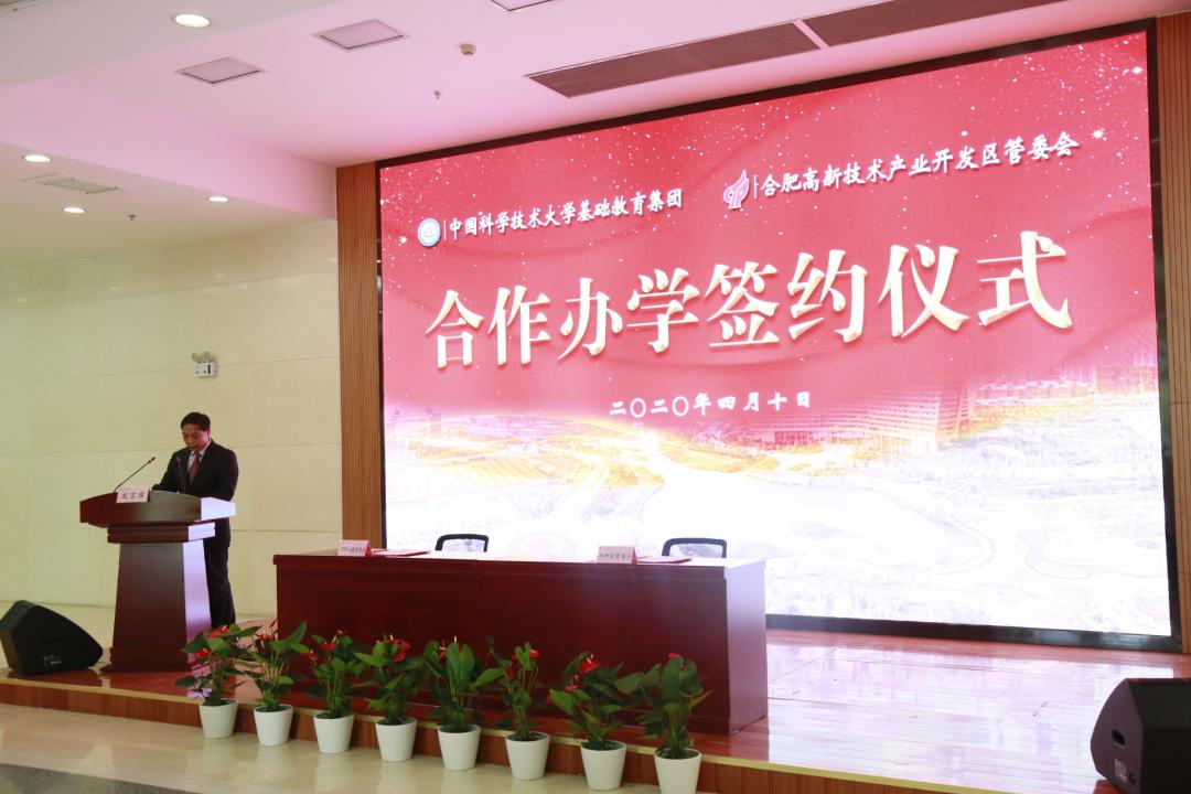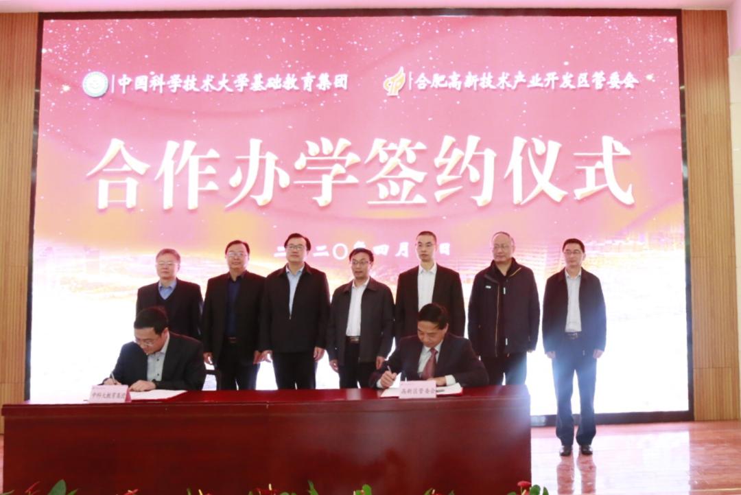 根据协议,中国科大基础教育集团将派遣管理团队,享有办学自主权。“中国科大附中高新中学”和中国科大附中实行同质管理、同步教学、同等考核,着力将合作新办学校打造成为全市、全省乃至全国的“名校”。合作学校教师采用区内择优选聘及新教师招聘相结合的方法予以配备。同时,每年选派部分优秀教师至中国科大附中或合作学校进行跟岗培训及挂职锻炼。合肥高新区工委委员、管委会副主任曹效记表示,在新冠肺炎疫情防控取得阶段性胜利、全国由复工复产向开学复课过渡的重要时期,在即将迎来习近平总书记视察安徽四周年之际,合肥高新区管委会与中国科大基础教育集团举行合作办学签约仪式,这是继2019年与合肥六中合作举办合肥高新创新实验中学以来,高新教育发展史上的又一件大事、喜事,具有里程碑意义。此次合作办学,是贯彻党的十九大及十九届三中、四中全会精神,落实习近平总书记视察安徽重要讲话精神,全面践行“实施名校战略、打造与世界一流高科技园区相适应的基础教育”的一项战略举措,必将推动合肥高新区乃至合肥市的基础教育发展,推动“世界一流高科技园区”、“和谐高新”建设以及“名校战略”实施,亦有利于提升中国科大基础教育集团集团化办学水平和知名度,进一步发挥其示范引领、辐射带动作用。—