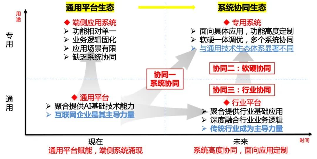 在通用领域,通用平台将进一步分化为提供人工智能基础能力的基础平台和融合行业基础应用的行业平台两个方向。在专用领域,现有的端侧应用无论是功能还是可扩展性上都远远达不到实际的泛化应用需求,因此未来面向泛化应用将呈现专用系统这个形态,专用系统最大特点是它不仅仅是端侧应用的软硬件固化,而是通用平台、行业平台和端侧应用的协同组合,以软硬一体的方式实现具体应用的功能定制和扩展。未来,人工智能的生态主体也将逐渐变成人工智能技术的使用者,即各个垂直行业的传统企业。