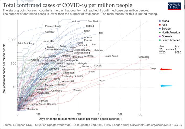 如果去除疫情重灾区湖北的话,中国每百万人中只有 11 名患者(蓝色箭头),甚至低于咱们的邻居日本和韩国。