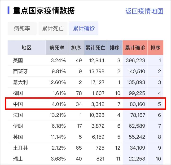 虽然中国是最早出现疫情的国家,目前确诊患者数量位列全球第五(截至 4 月 8 日),但是由于人口众多,中国的发病率(红色箭头)并不在前列。