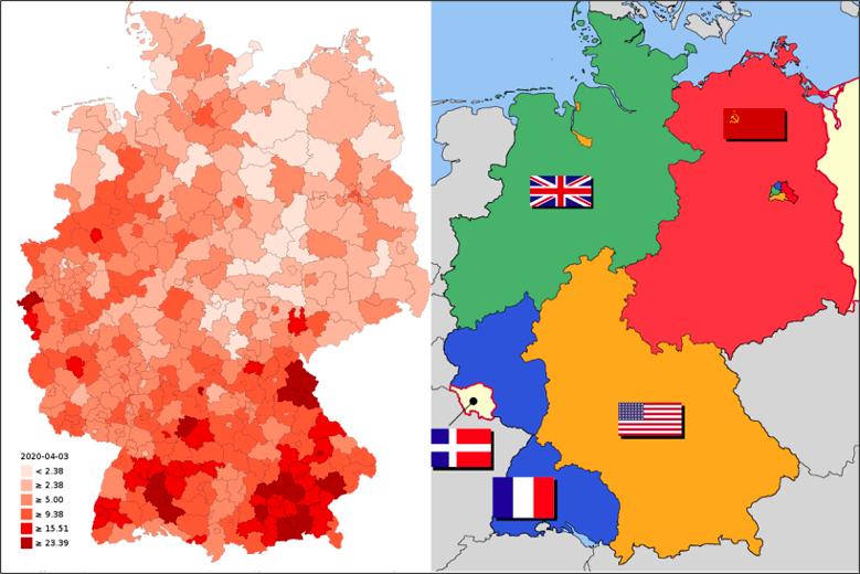 根据目前的疫情情况,原西德地区的新冠肺炎发病率显著高于原东德地区。