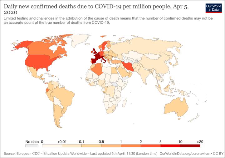 放眼全球,下图是全球各个国家每百万人中死于新冠肺炎的人数统计,颜色越深,百万人中死于新冠的人数就越多。
