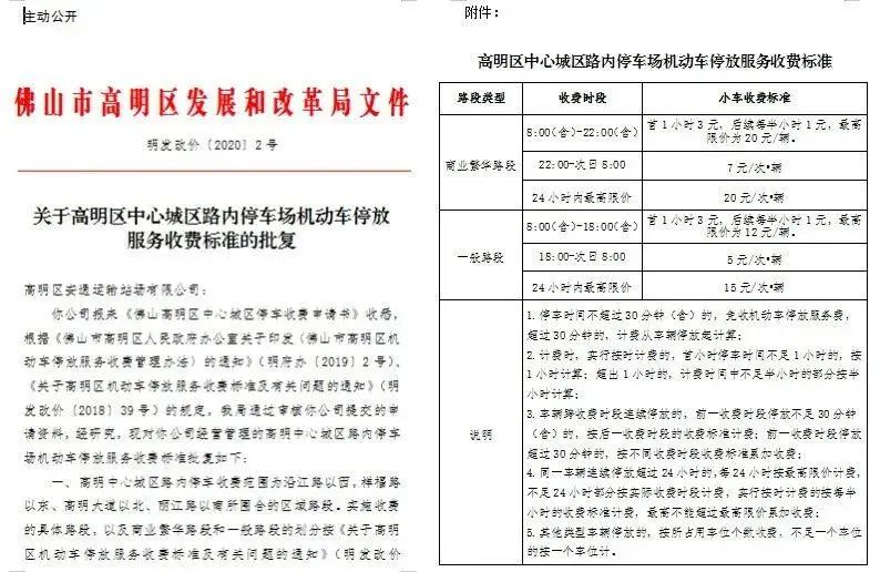 根据《关于高明区中心城区路内停车场机动车停放服务收费标准的批复》(【2020】2号)文件规定,高明区中心城区路内停车收费标准分繁华路段和一般路段,还有白天标准和夜间标准。统一免费时间都是停车前半小时免费。