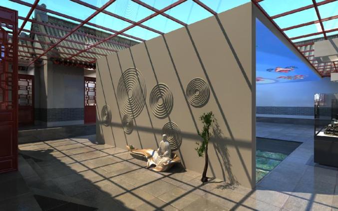 岢岚县主题院落以四合院主体为依托,以岢岚“历史重镇、清凉山城、养身福地”定位为主线,辅以军事文化为亮点,通过设计手法,将休闲文化与军事文化相融合,突出文化氛围。