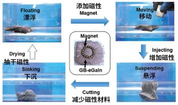 文中提到了添加磁性材料的简单应用,利用磁性材料可以控制 GB-eGaIn 在水中的浮沉以及定向运动。