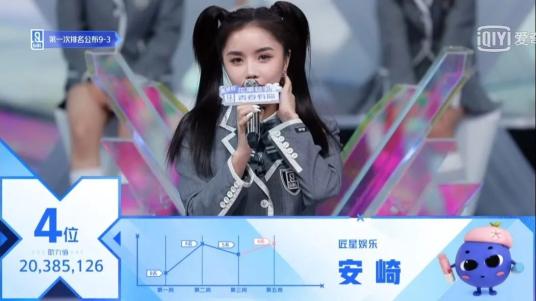 另一位被普遍看好、剑指出道位的,是以264票拿下第一次公演现场dance组第一的安崎。其经纪公司匠星娱乐成立于2015年,是合纵文化集团旗下的子公司,而身为上市公司的合纵文化主营连锁音乐餐厅、连锁KTV等实体娱乐,旗下门店包括SOHO酒吧、胡桃里等等,曾在节目前期引起争议的“冰清玉洁”四姐妹,同样也是合纵文化旗下。在《青春有你》第一季中,匠星娱乐的嘉羿以第5名成团出道,而第二季第一次排名公布中人气选手安崎和上官喜爱分别位列第4和第10名,同样有出道可能。