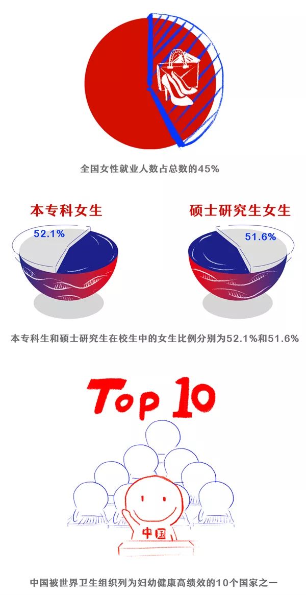 2012年,“坚持男女平等基本国策,保障妇女儿童合法权益”写进党的十八大报告,成为党的施政纲领。2015年9月2日,国务院新闻办公室发表《中国性别平等与妇女发展》白皮书,从中可以看到:全国女性就业人数占总数的45%;本专科和硕士研究生在校生中的女生比例分别为52.1%和51.6%;中国被世界卫生组织列为妇幼健康高绩效的10个国家之一······