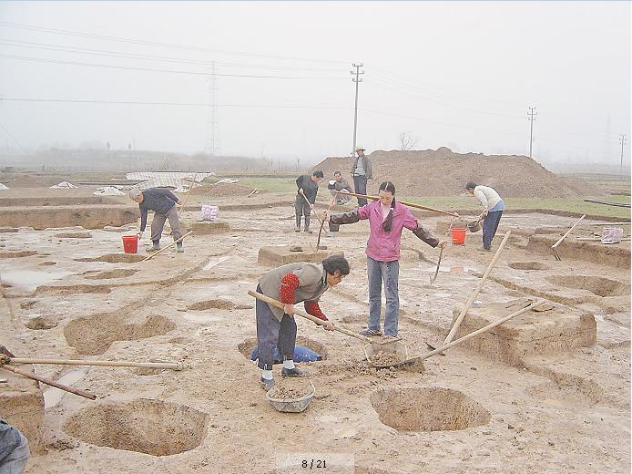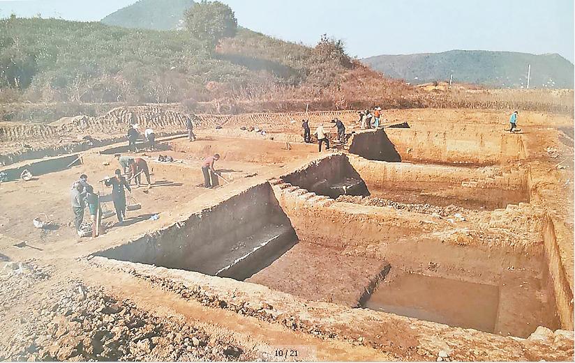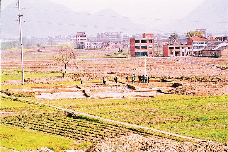 2001年元宵刚过,考古队就开始进驻黄宅镇渠南村。由于萧山跨湖桥遗址的发掘必须在5月进行,所以留给��塘山背和上山的时间最多只有三个月。然而发掘工作没有预想中顺利。��塘山背发掘区普遍出现了春秋战国时期的文化遗迹,干扰了对良渚文化墓葬的寻找。墓葬填土与生土的差别本就十分细微,辩识工作十分艰难,而上半年的多雨更给野外工作带来了影响。但凡事总有利弊,后来考古队员发现,经过雨水的浸润,墓葬填土反而更易区分,于是主动泼水浇地,加快了进程。这一方法后来也应用到上山的发掘中。