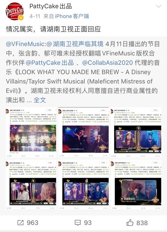 然而与此同时,一家名为VFine Music的音乐管理和发行平台在微博上发表维权声明称,两位艺人翻唱的曲目并未经过授权,并直指湖南卫视已经多次侵权,且无视版权方的沟通。