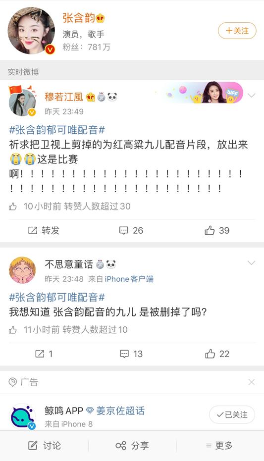 4月11日晚间,《声临其境》第三季最后一期节目中,郁可唯、张含韵同穿西装登台,从语言、台词到唱功气场全开,展开了一场《女巫茶话会》配音秀,为迪士尼音乐剧中的七位女巫配音,且不同音色无缝切换。在如此精彩的表演带动之下,全场气氛嗨爆。节目播出后,其收视达到双域第一,“张含韵郁可唯配音”的话题也迅速登上了热搜。