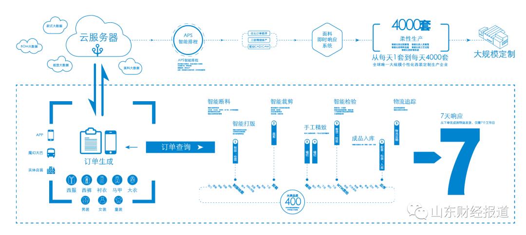 得益于大数据的驱动,酷特智能实现了以工业化的手段、效率、成本制造个性化产品的能力,相比传统定制工厂一个月甚至更长的生产周期,酷特智能只需七个工作日就可交货,酷特智能已不再是传统的制造企业,看似“相同产品”的背后,驱动的却是无法用眼睛洞察的数据力量。