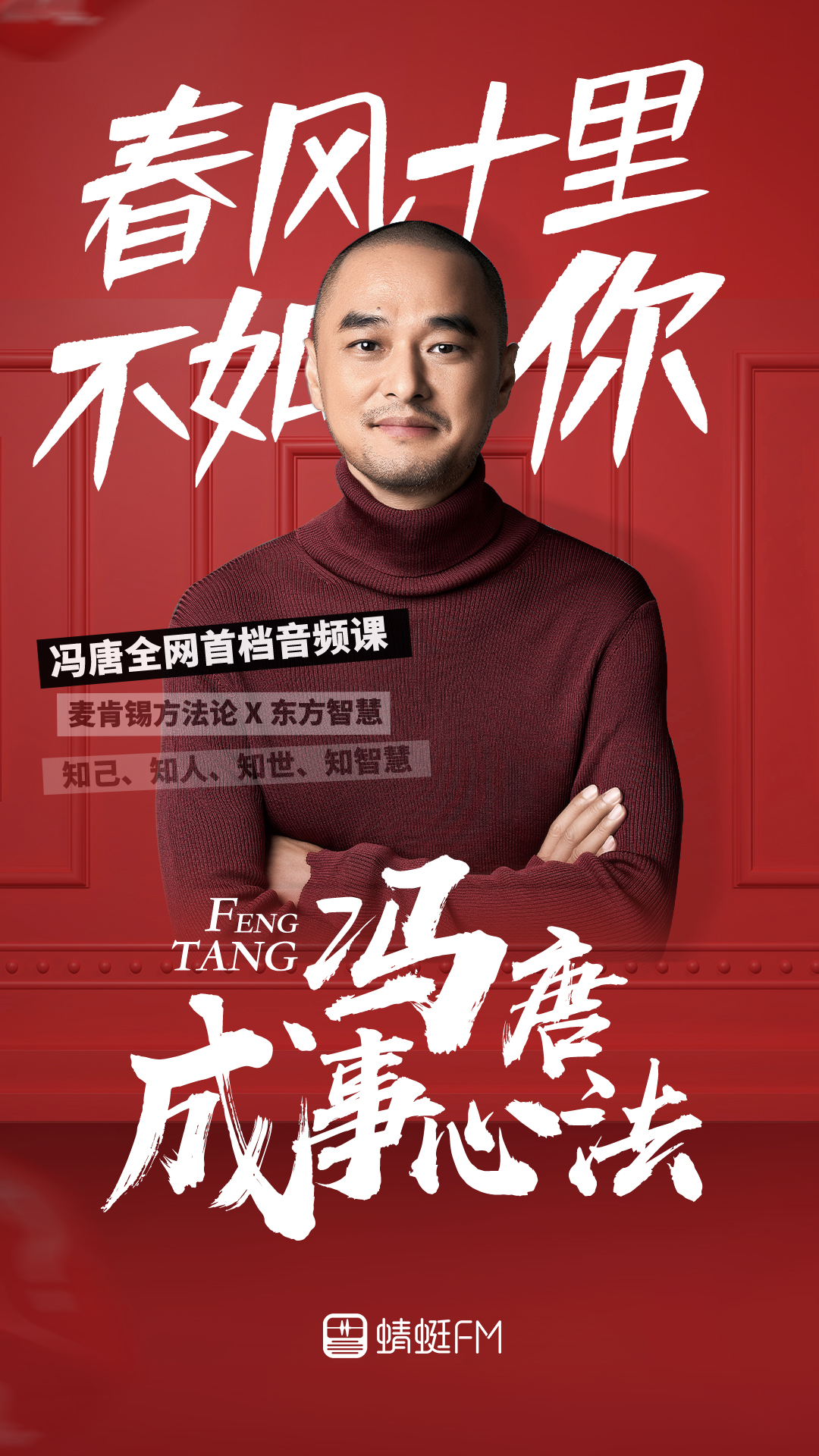 4月17日,冯唐的首个音频节目,与蜻蜓FM联合出品的《冯唐成事心法》正式上线,在“成事”于医学、文学、管理界之余,冯唐再度跨界在线音频领域,首次以声音的方式亲授跨界成事的底层逻辑,分享他在实践麦肯锡方法论、研习东方先贤智慧之中领会的“成事心法”。