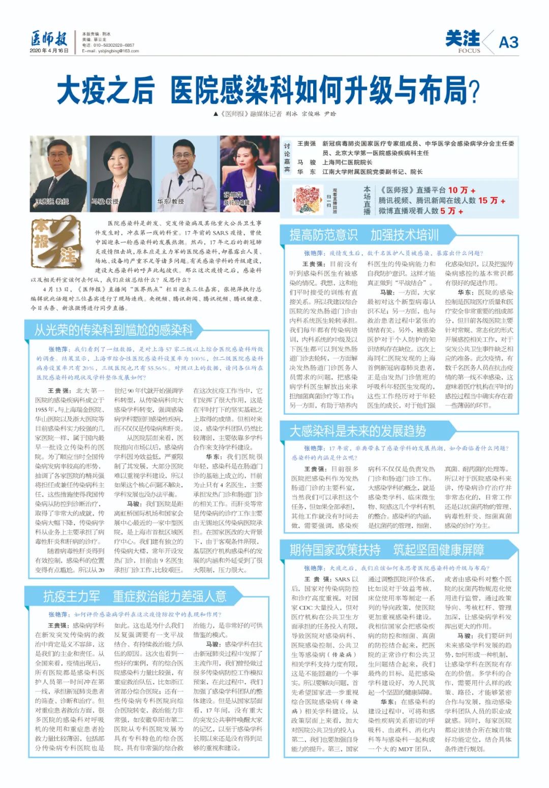 4月13日,《医师报》直播间“医界热点”栏目迎来三位嘉宾,张艳萍执行总编辑就此话题对三位嘉宾进行了现场连线。央视频、腾讯新闻、腾讯视频、腾讯健康、今日头条、新浪微博进行同步直播。