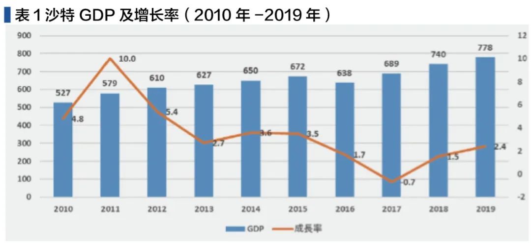 沙特阿拉伯是隶属于海湾协作组织的经济大国,自2012年以来经济增长遭遇瓶颈,由于石油产量的减少,实际GDP的增长率在2011年达到顶点10%后逐年减少,2013年仅为2.7%,2014年虽有小幅增长,但15年随着全球范围石油价格的下跌再次滑落,2017年甚至达到-0.7%。为缓解这一现状,沙特政府推行经济多元化发展,奖励民营化经济,促进对外贸易的自由化、推行投资制度的改革,为摆脱石油经济的限制,沙特政府颁布了长期国家战略《2030愿景》,以非石油经济的开发为中心,加强民间投资以创造就业。