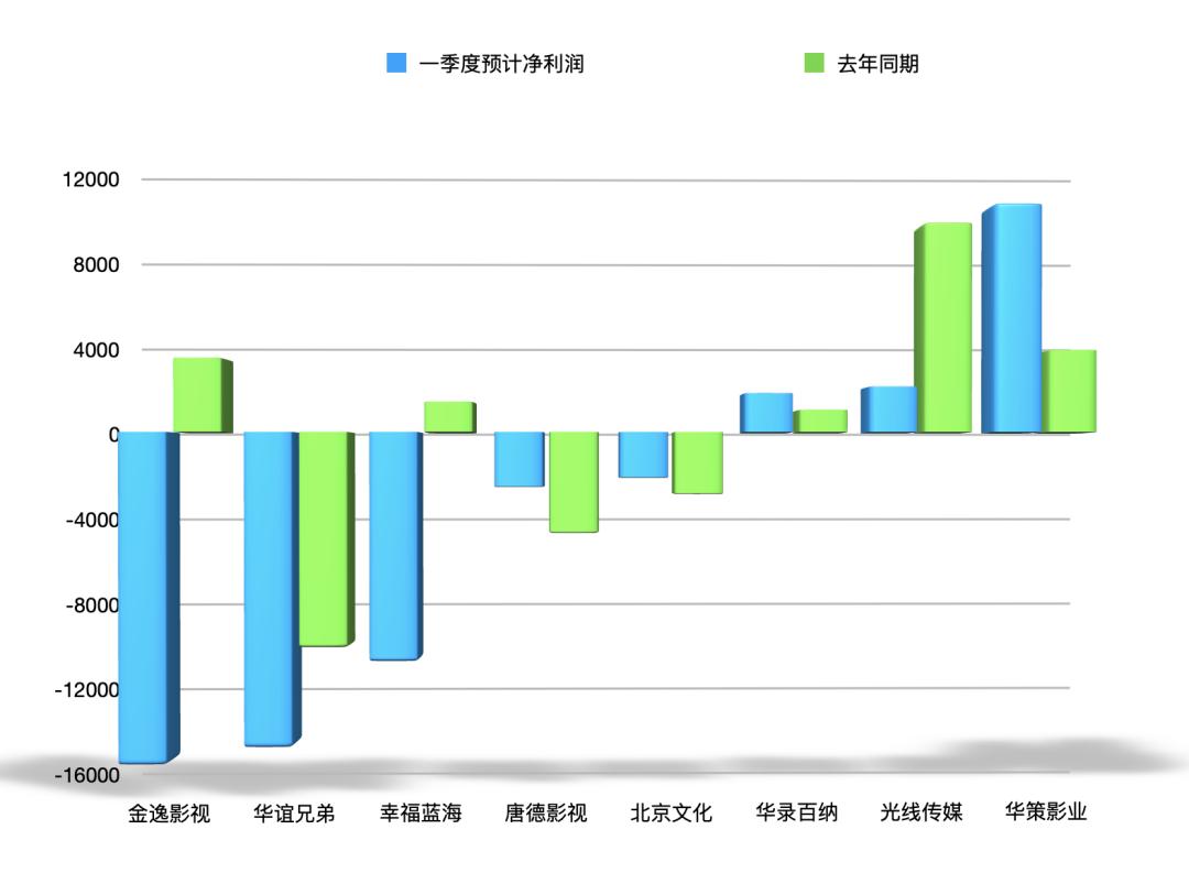 除了万达外,疫情同样影响着其余影视公司,数据显示,华谊兄弟一季度预计亏损1.42亿-1.37亿元,金逸影视一季度预计亏损1.45亿-1.6亿元,幸福蓝海一季度预计亏损1亿-1.05亿元,唐德影视一季度预计亏损2900万-2400万元,北京文化一季度预计亏损2000万元-3000万元。