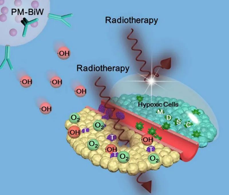 为了增强癌细胞,尤其是深层乏氧组织癌细胞对于放射线的敏感性,引入活性氧组分或利用金属原子的韧致辐射诱导自由基产生是两大主流策略,我们的科学设想是能否通过单一纳米药物同时触发两种增敏模式,最大限度增强射线对于癌组织杀伤,同时需要解决的关键问题是该治疗策略既要触发自由基产生,同时又不能以组织内氧气为原料,否则将会导致乏氧情况恶化。