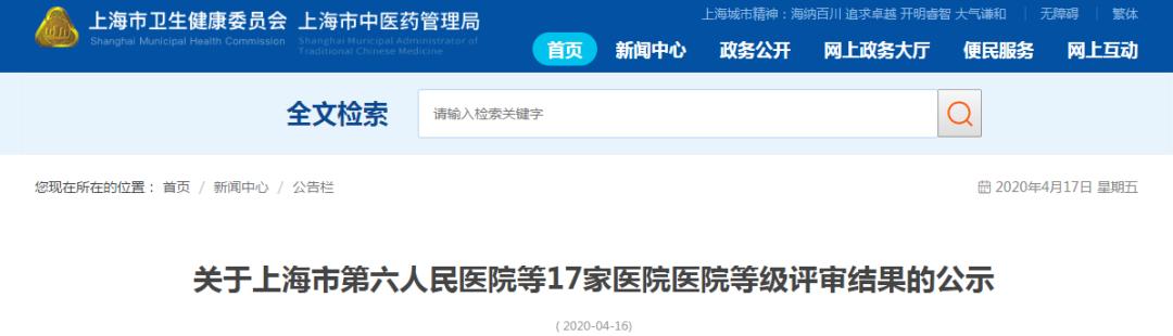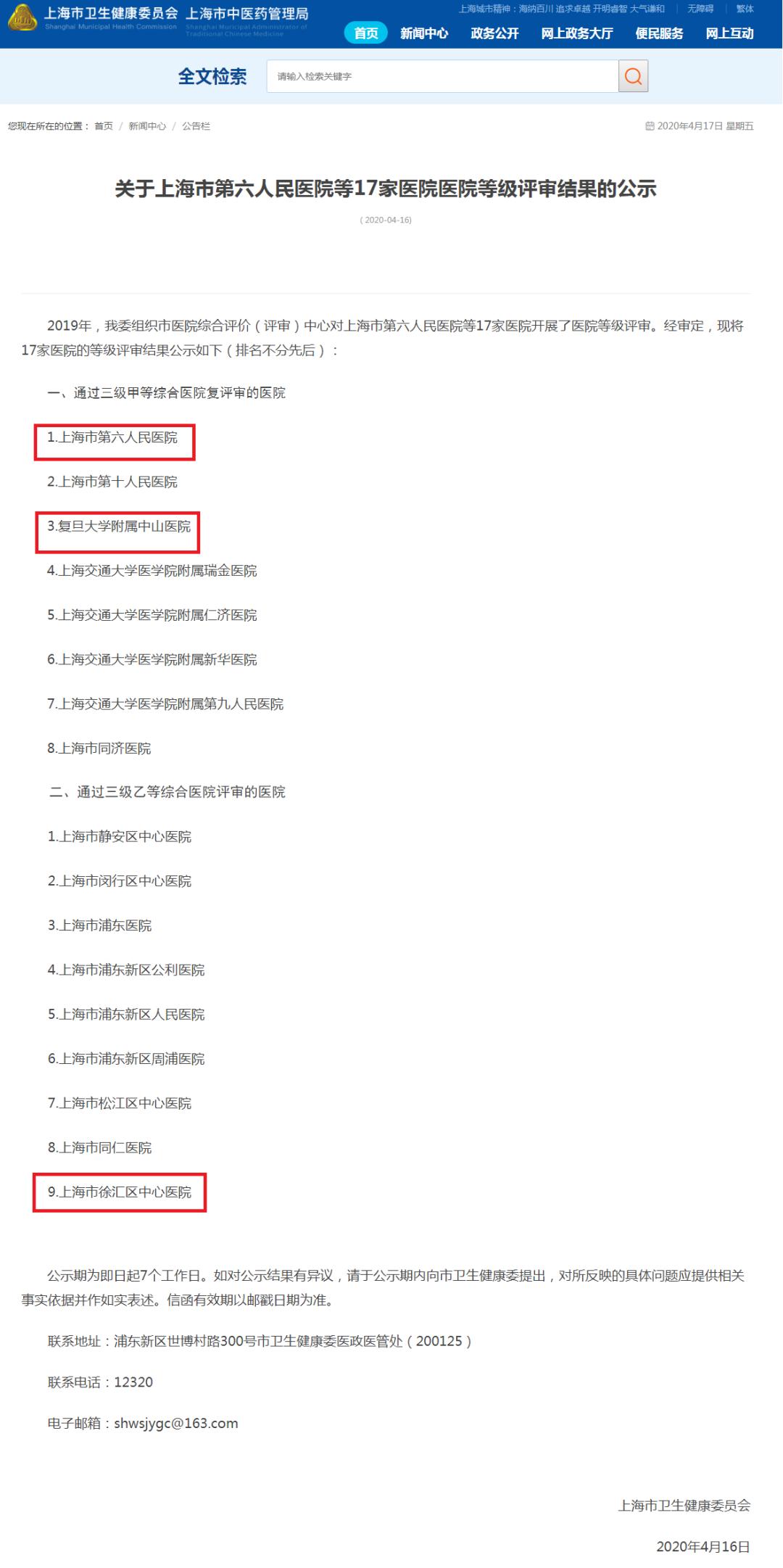 另外,在这次公示的结果中,徐汇辖区内上海市第六人民医院、复旦大学附属中山医院也通过三级甲等综合医院复评审。