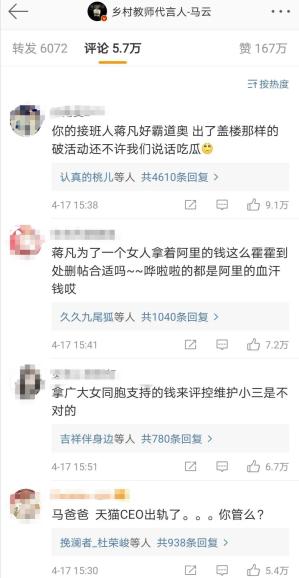 想评论却四处碰壁找不到评论出口的网友们,纷纷在马云微博下留言。截止到4月20日8点,马云微博最近更新的一条微博下已经有5.7万评论。