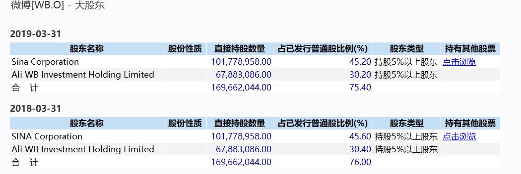 据微博向美国SEC递交的文件,截至2019年3月31日,新浪持有微博45.2%股权,为第一大股东,拥有71.2%的投票权;阿里持股30.2%,拥有15.8%的投票权,为微博第二大股东。