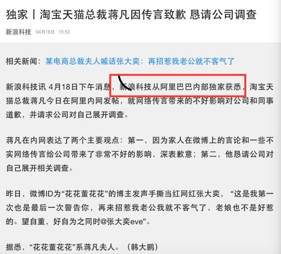新浪科技率先在网络上发布文章《独家丨淘宝天猫总裁蒋凡因传言致歉 恳请公司调查》。