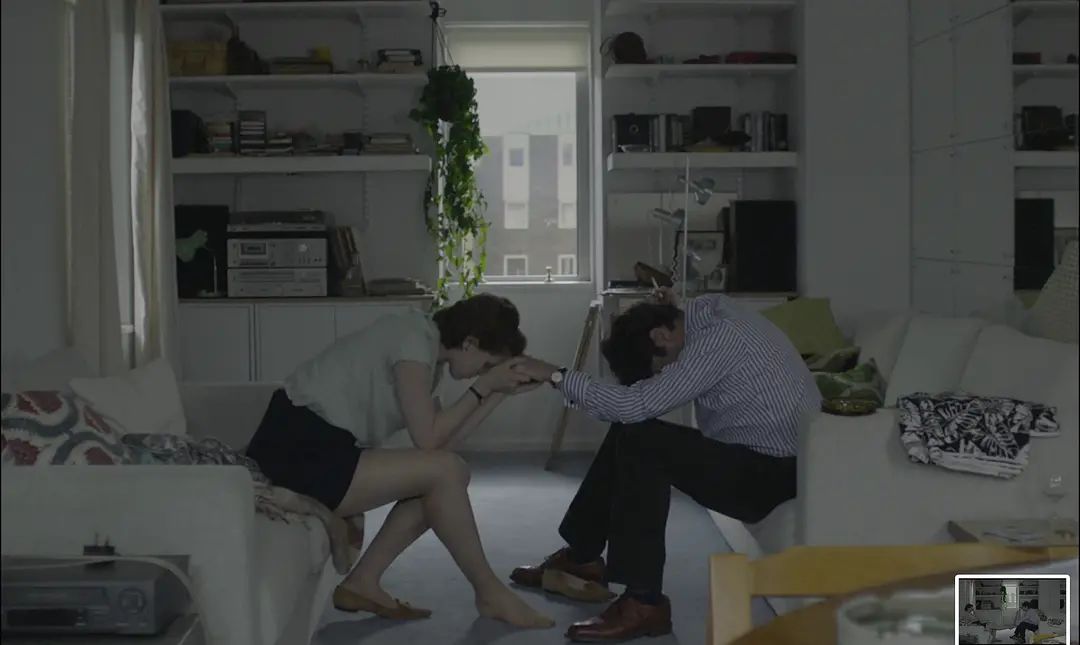 然而在《纪念品》中,这种极致的手法,或多或少地被舍弃了。开始有过肩镜头,正反打,或者是主观镜头(有很多主观镜头是由16mm胶片呈现的,这反而增加了间离感),观众的期待开始得到满足——他们开始看到主人公看到的一切。于是上述“修辞”效果就彻底地被削弱了。
