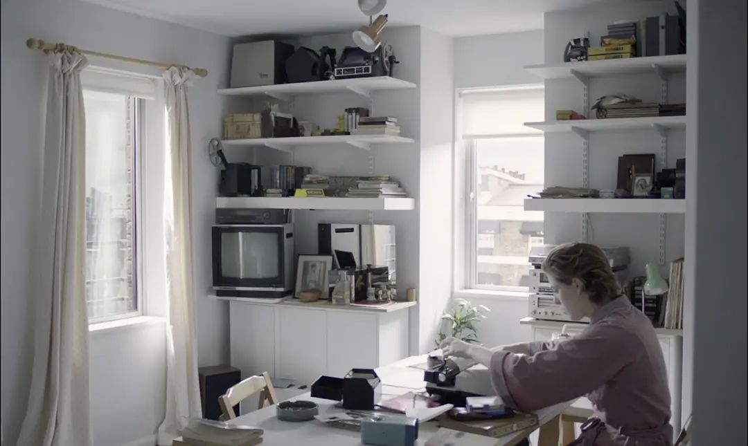 1.先从【美术设计】谈起,故事设定的时间是80年代上半,从新闻中的爱尔兰共和军炸弹事件(1983)和利比亚大使馆抗议事件(1984)可以大致看出,社会的混乱和动荡也可以视作和角色内心的起伏相呼应,朱莉对社会问题的“关切”很大程度上也受此影响。这也是一个数字化来临之前的时代,因此写信、打电话、广播、打字机写作等等仍然盛行(因此,电影本身使用胶片拍摄也就自然而然了)。霍格事无巨细地还原了这个时空,公寓完全就是她自己年轻时的居所,甚至窗户外面的景象都是根据她拍摄的照片来复刻的。而公寓作为绝大多数情节发生地,和霍格之前作品的封闭空间一以贯之:例如《与我无关》的乡间别墅和《展览会》中主角搬出的家。霍格是个对建筑空间非常敏感的人,想必各位也有感触,之后可以谈一谈。